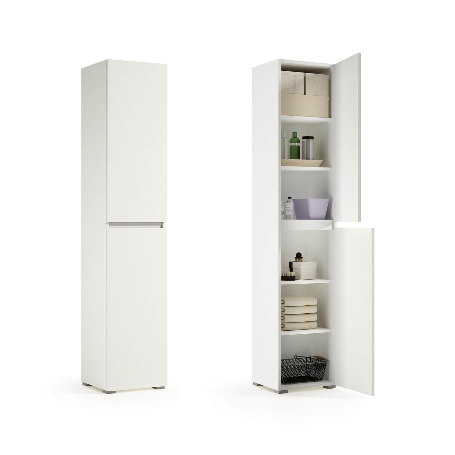 The absence of handles renders these multi-purpose wardrobes extremely versatile, suitable for any environment or configuration. The tall version of the wardrobe has seven height-adjustable shelves, thus offering a compact furnishing solution with impressive capacity.